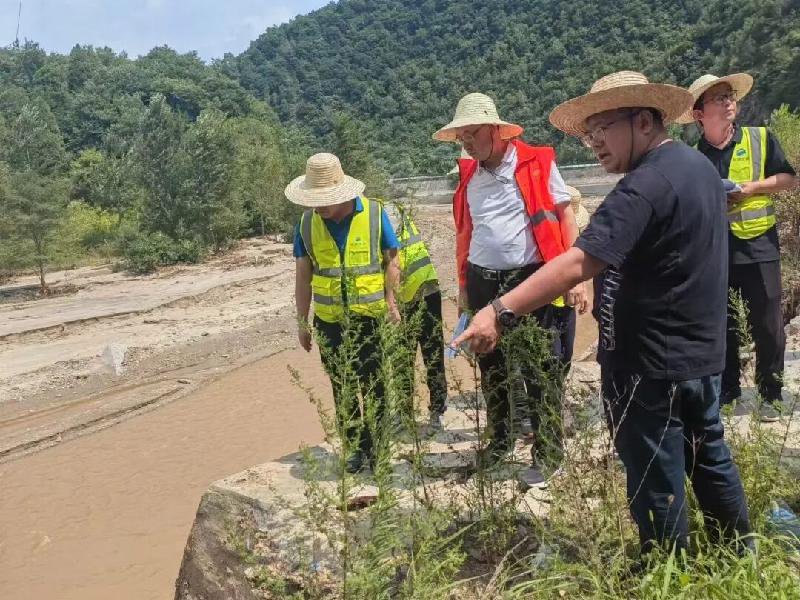 廖海东在水毁发生后和设计单位、养护单位踏勘水毁现场(图片正中位置)