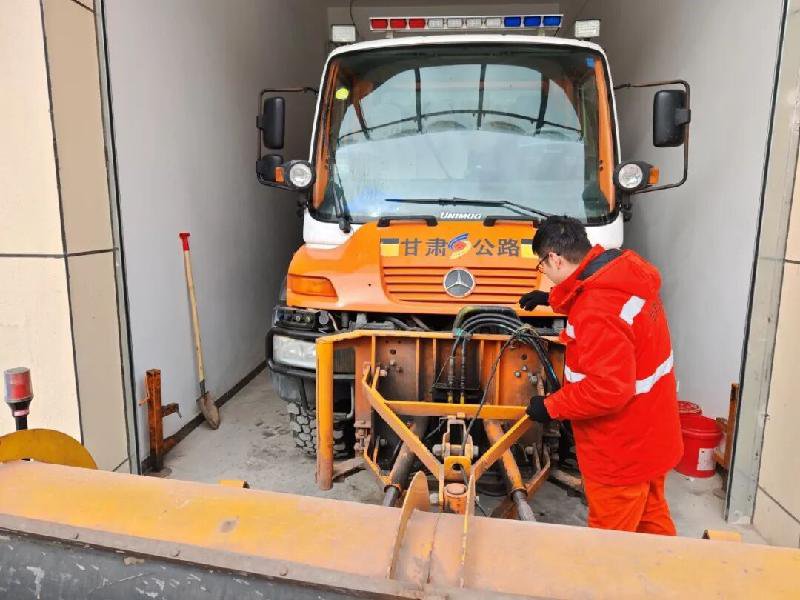 与此同时,肃南养护站的职工们早早就开始了当日的道路巡查保洁工作。寒风中,巡查车沿着G213线蜿蜒前行,途径易落石路段,路面上的零星落石影响过往车辆安全通行,巡查人员戴好安全帽,立即下车对落石进行清理,橘色的养护服在蓑草寒烟的山间格外耀眼。在海拔更高的东山隧道,技术员刘钊瑞正检查着隧道内的各项设施,他们手持强光手电筒,逐段扫视隧道内壁与顶部,认真检查着隧道内的照明设施、感应门和排水沟的电伴热装置。这日复一日地守护,是公路人最深沉的承诺。